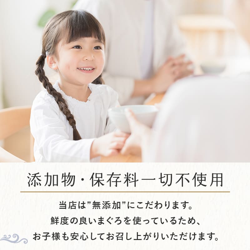 原材料:めばちまぐろ(太平洋)、醤油(大豆:遺伝子組み換えの混入を防ぐため分別)、砂糖、かつお節だし、発酵調味料